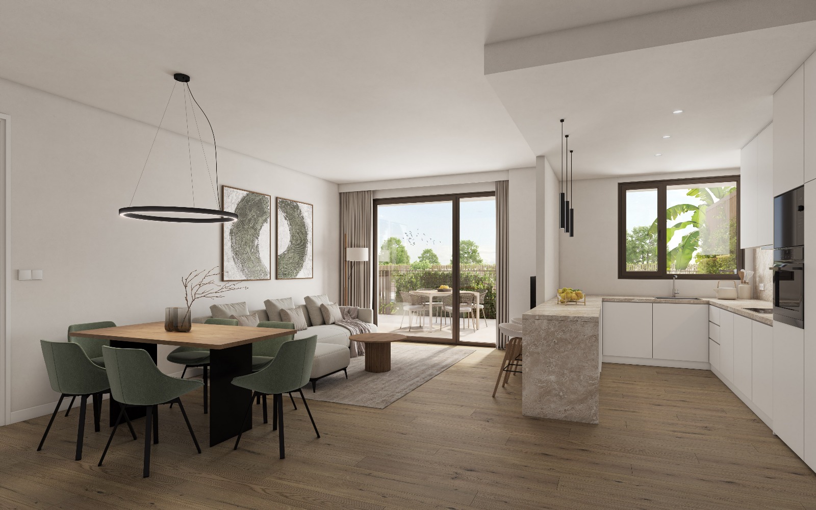 El nuevo residencial en Bormujos se ha diseñado en forma de “L” creando un amplio espacio común ajardinado, pensado como el corazón del conjunto. Este diseño no solo permite que todas las viviendas disfruten de vistas abiertas y luz natural, sino que también crea un entorno tranquilo, protegido y acogedor para vivir.
